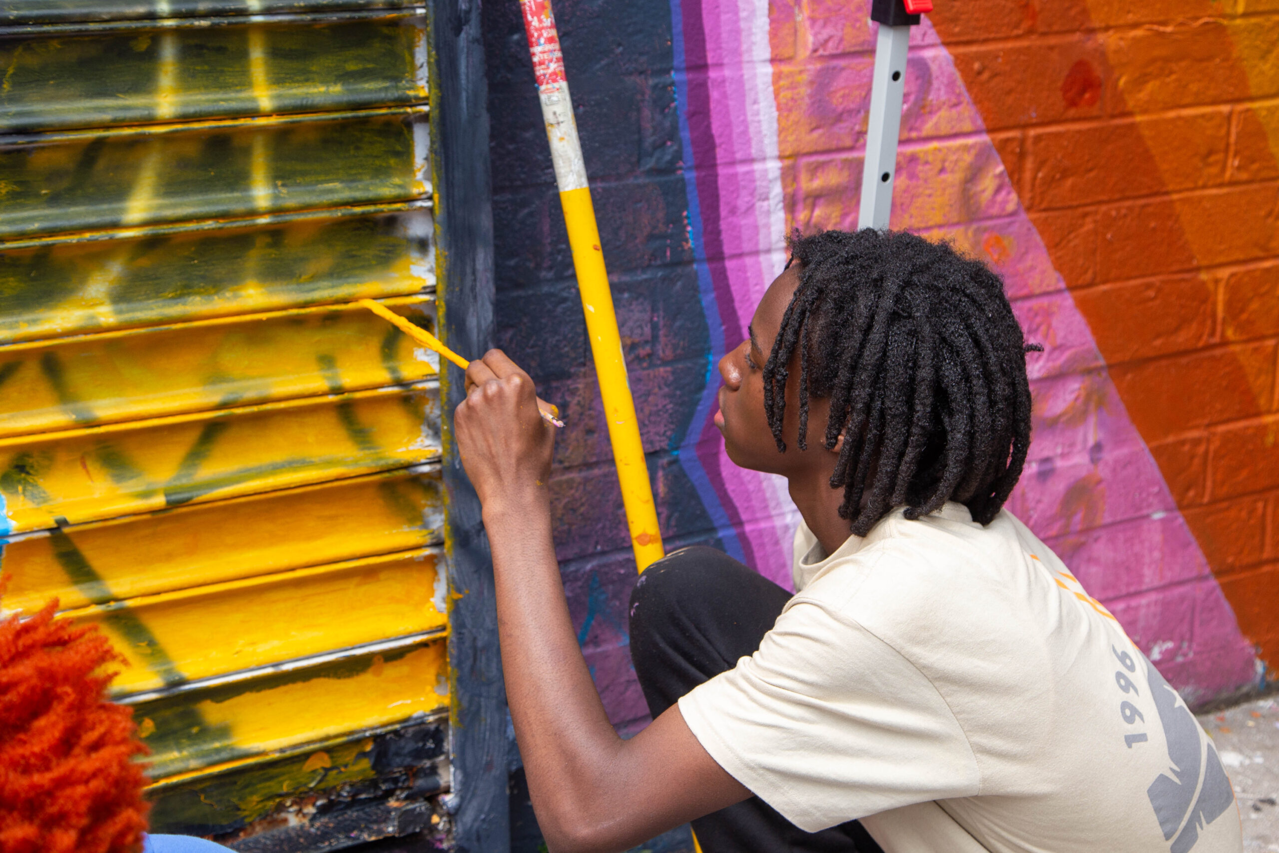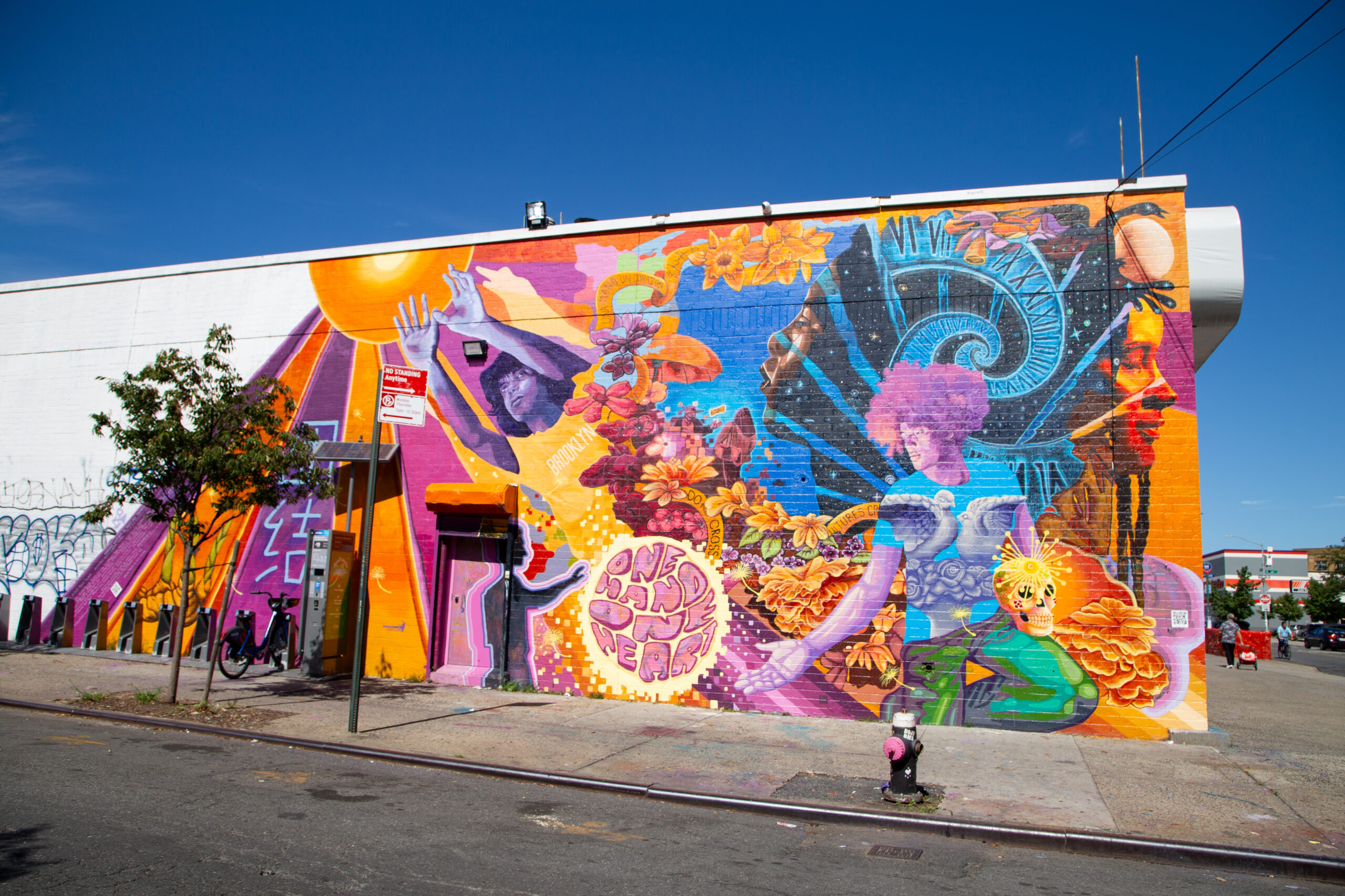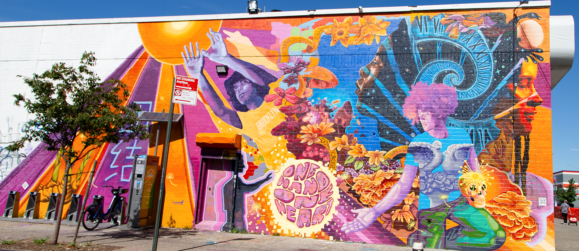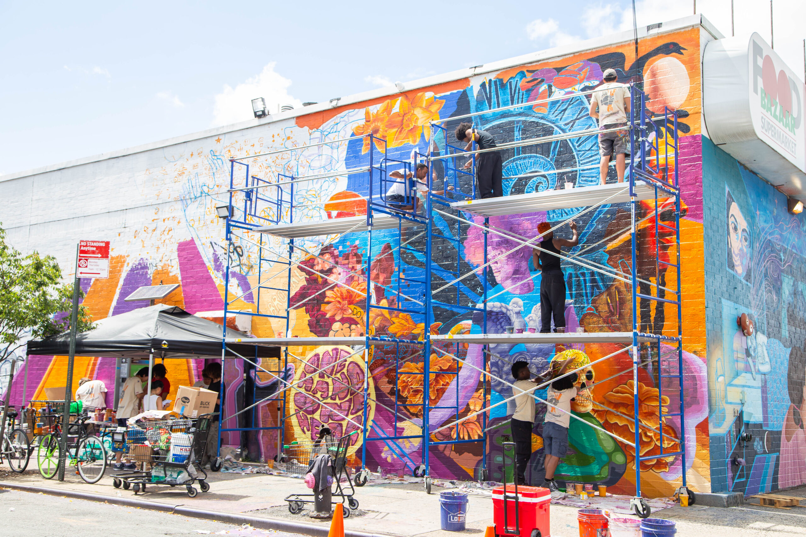 This mural was designed and painted by our Making His’tory Summer Leadership Institute (SLI) Program. Gracing the walls of Food Bazaar in Bushwick on Wyckoff Avenue, this mural is a testament to the transformative potential of youth of color in today’s society. Drawing inspiration from Afrofuturistic aesthetics and the Sankofa concept, it delves into the past to propose a brighter future. The mural is a visual journey, celebrating the culture, resilience, and commitment to challenging systemic oppression. It’s a multilingual masterpiece, amplifying the voices of neighbors and celebrating the vibrant energy of Bushwick and Brooklyn’s diverse communities. The mural’s intricate design includes symbols like the egg, representing hope and constant evolution, and caution tapes, sparking conversation about gentrification and discriminatory practices. By diving into the past and embracing cultural heritage, “El Paso Del Tiempo” tells the story where communities cohabit in harmony, united by shared dreams and collective aspirations.